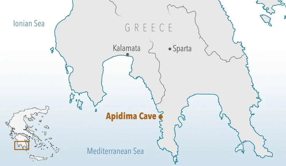 Apidima’s Odd Couple: Apidima Cave yielded two skulls in the same breccia block: Apidima 1 (210,000 years ago, Homo sapiens-like) and Apidima 2 (170,000 years ago, Neanderthal). This is the only known site with such close sapiens-Neanderthal proximity, suggesting possible coexistence or replacement in Greece.